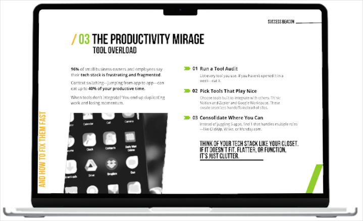 Twice a month, we distill the research and insights used to build the Success Beacon systems into a strategic briefing. These 4-minute reads cover everything from time-management to market authority—including real-time updates on our product build—providing you with data-backed tips and tactics you can apply immediately.